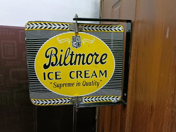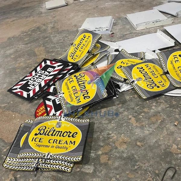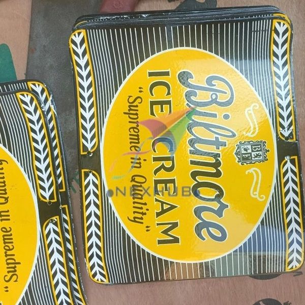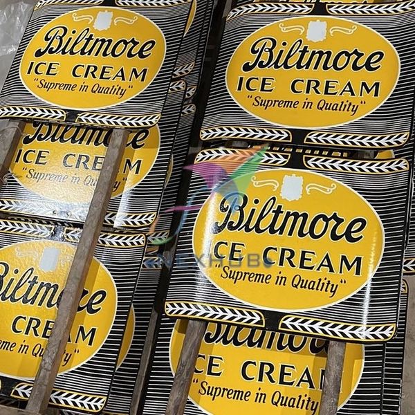 We take this opportunity to Introduce double sided 13" x 11" spinner porcelain signs windy edges with Iron brackets for wall support. Overall size 16" x 13". We hope you enjoy our site and take a moment to drop us a line.